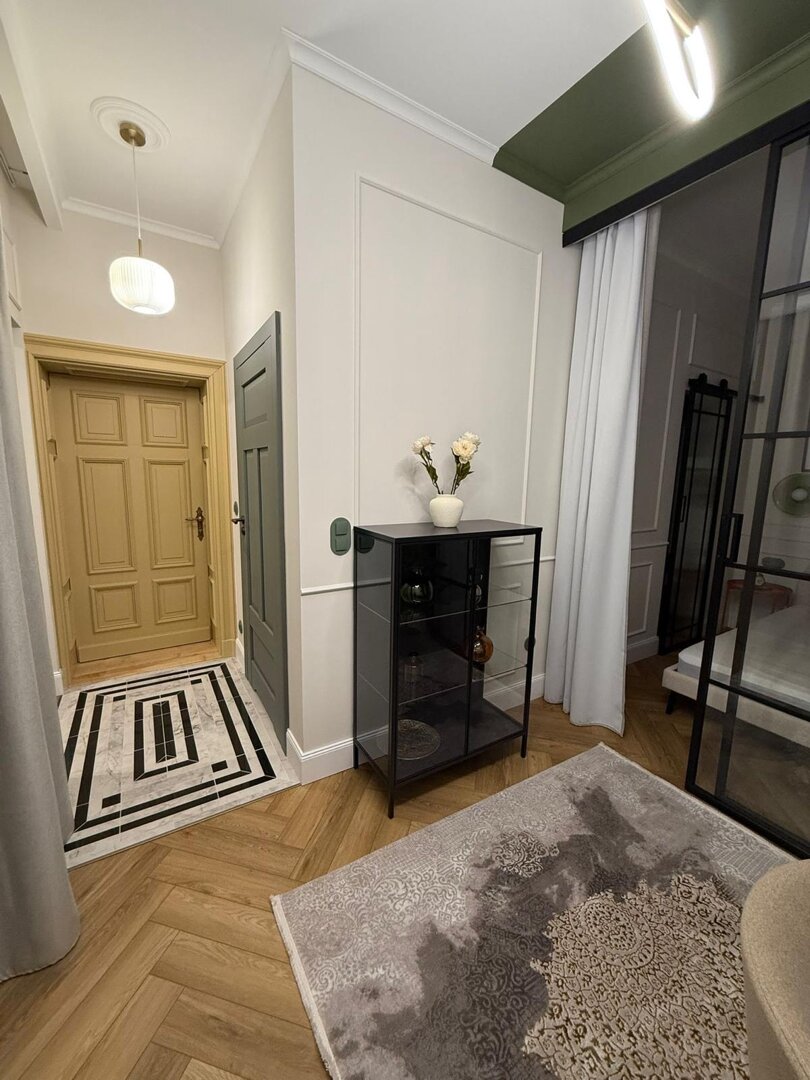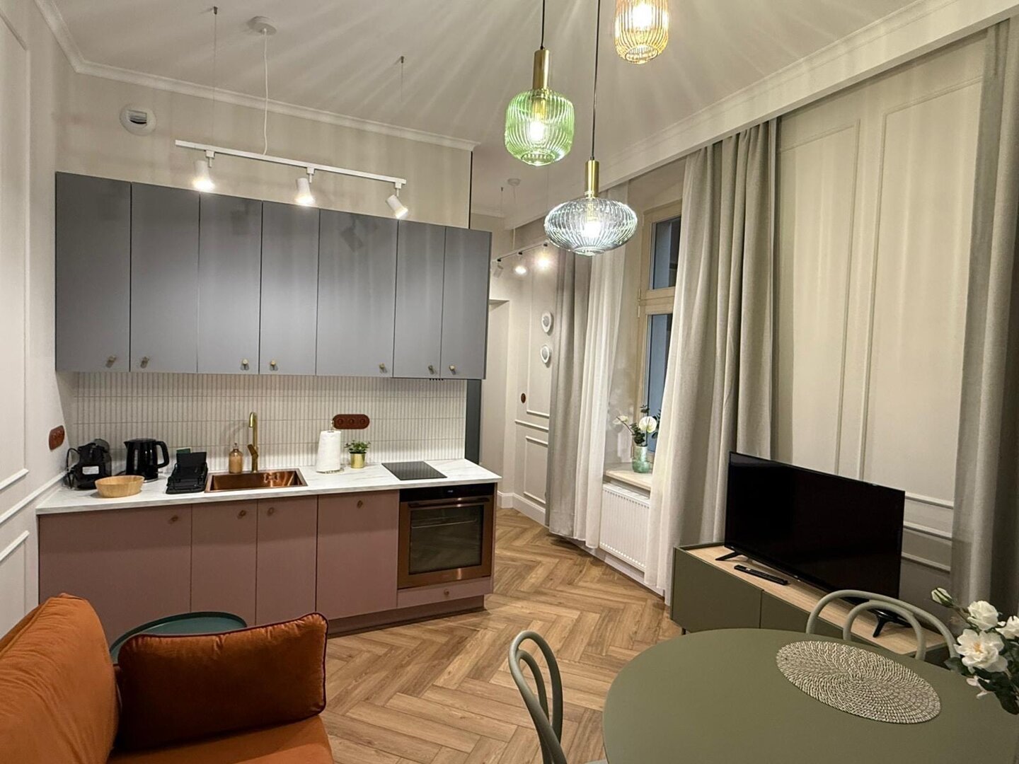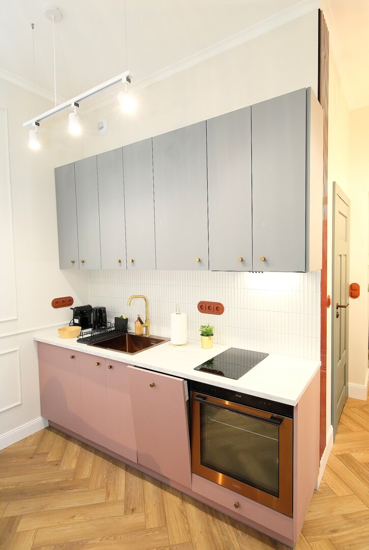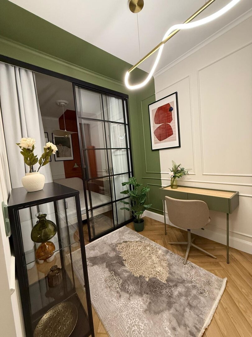 Klimatyczny apartament w odrestaurowanej kamienicy z pięknymi zdobieniami znajduje się w centrum Torunia. Nowoczesny a zarazem ciepły wystrój tworzą kolory, wygodne meble i oświatlenie.