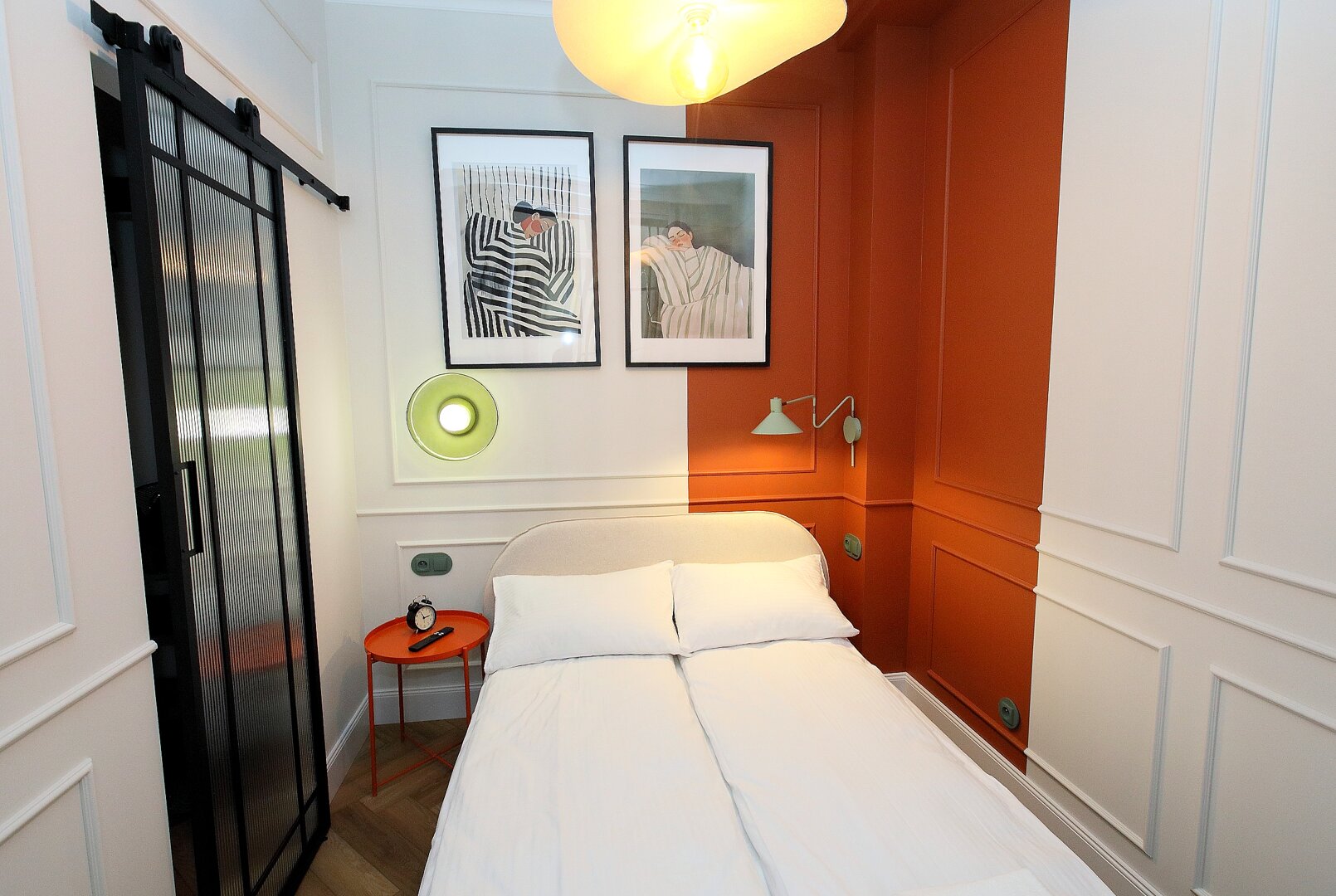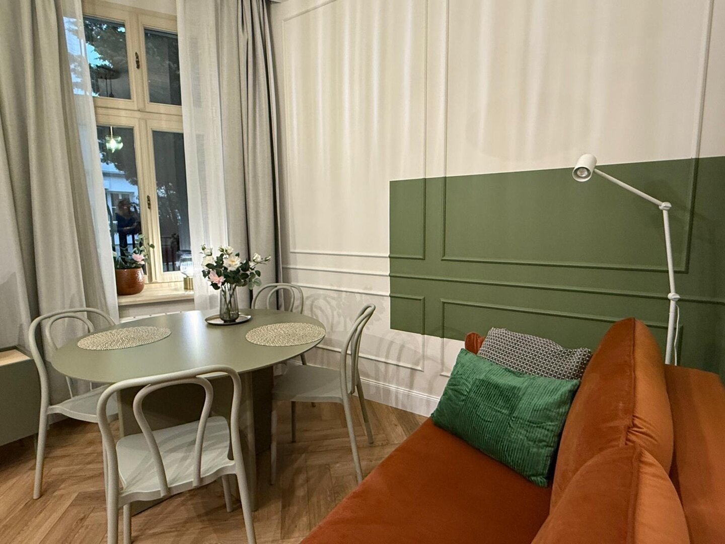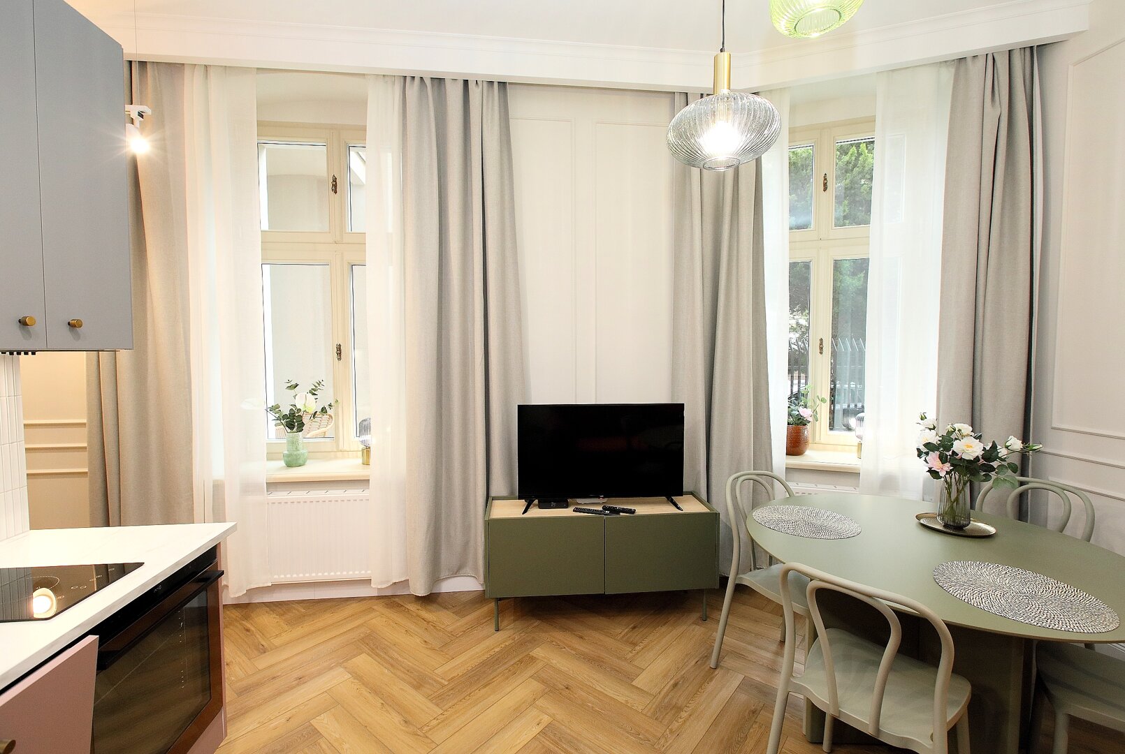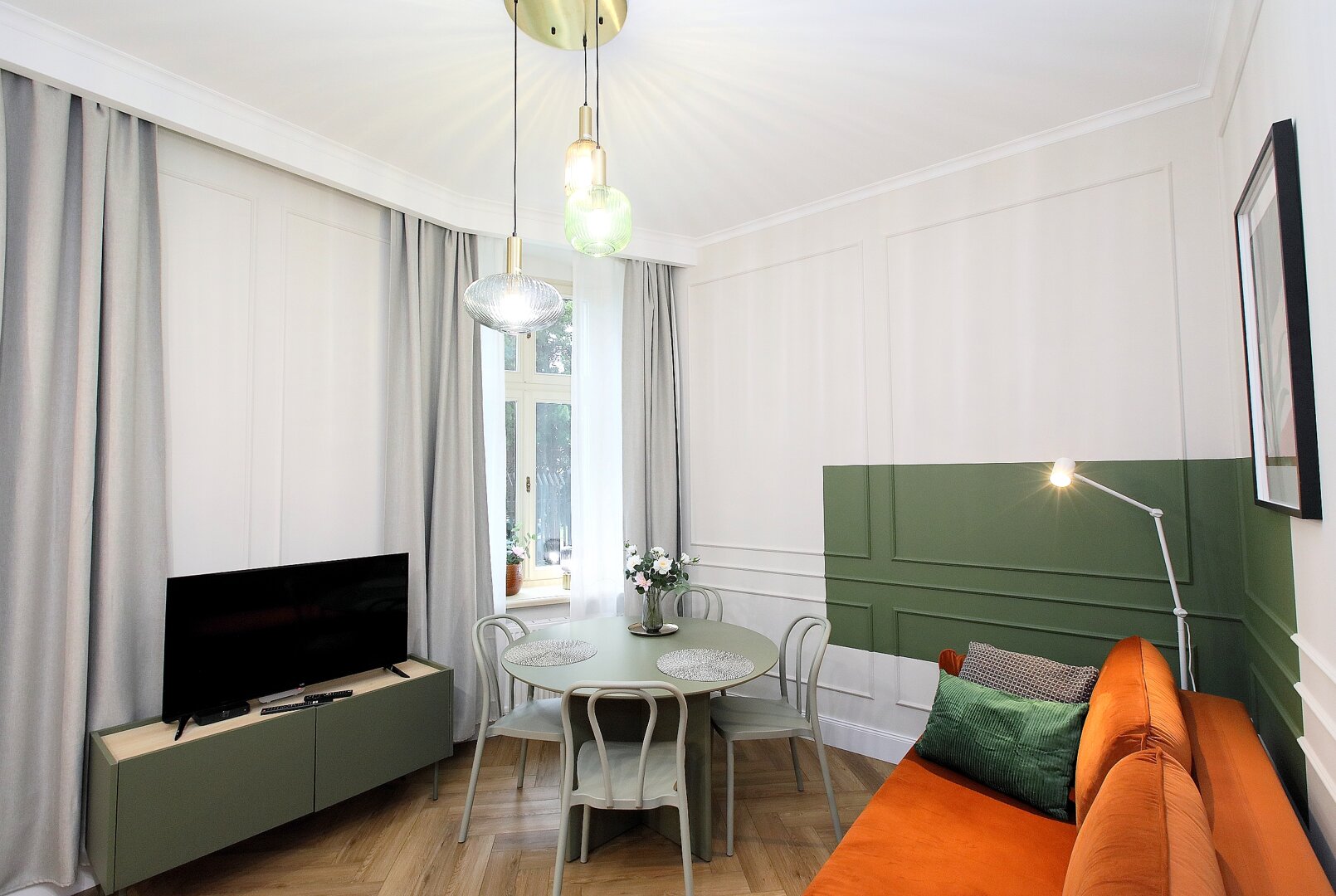 Klimatyczny apartament w odrestaurowanej kamienicy z pięknymi zdobieniami znajduje się w centrum Torunia. Nowoczesny a zarazem ciepły wystrój tworzą kolory, wygodne meble i oświatlenie.